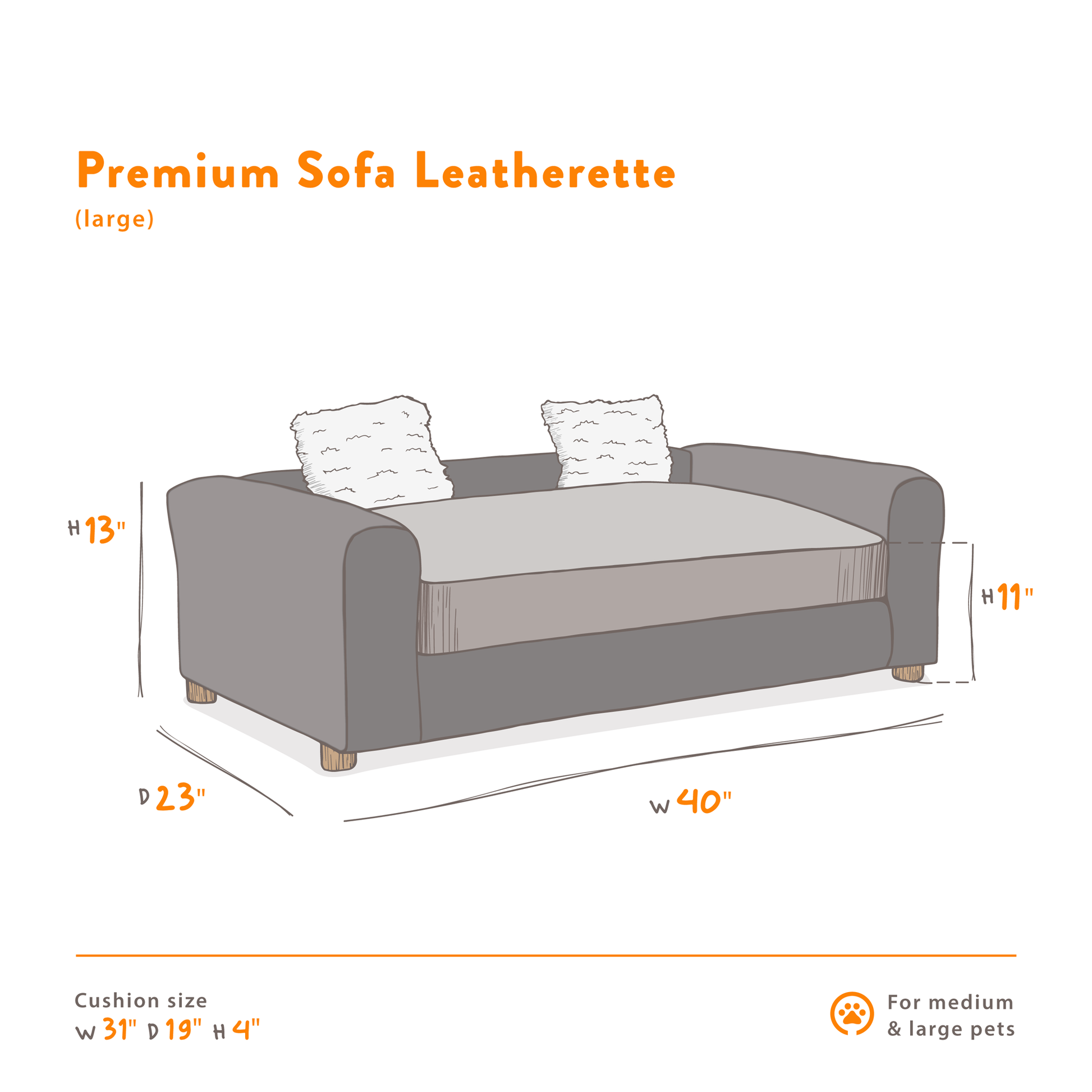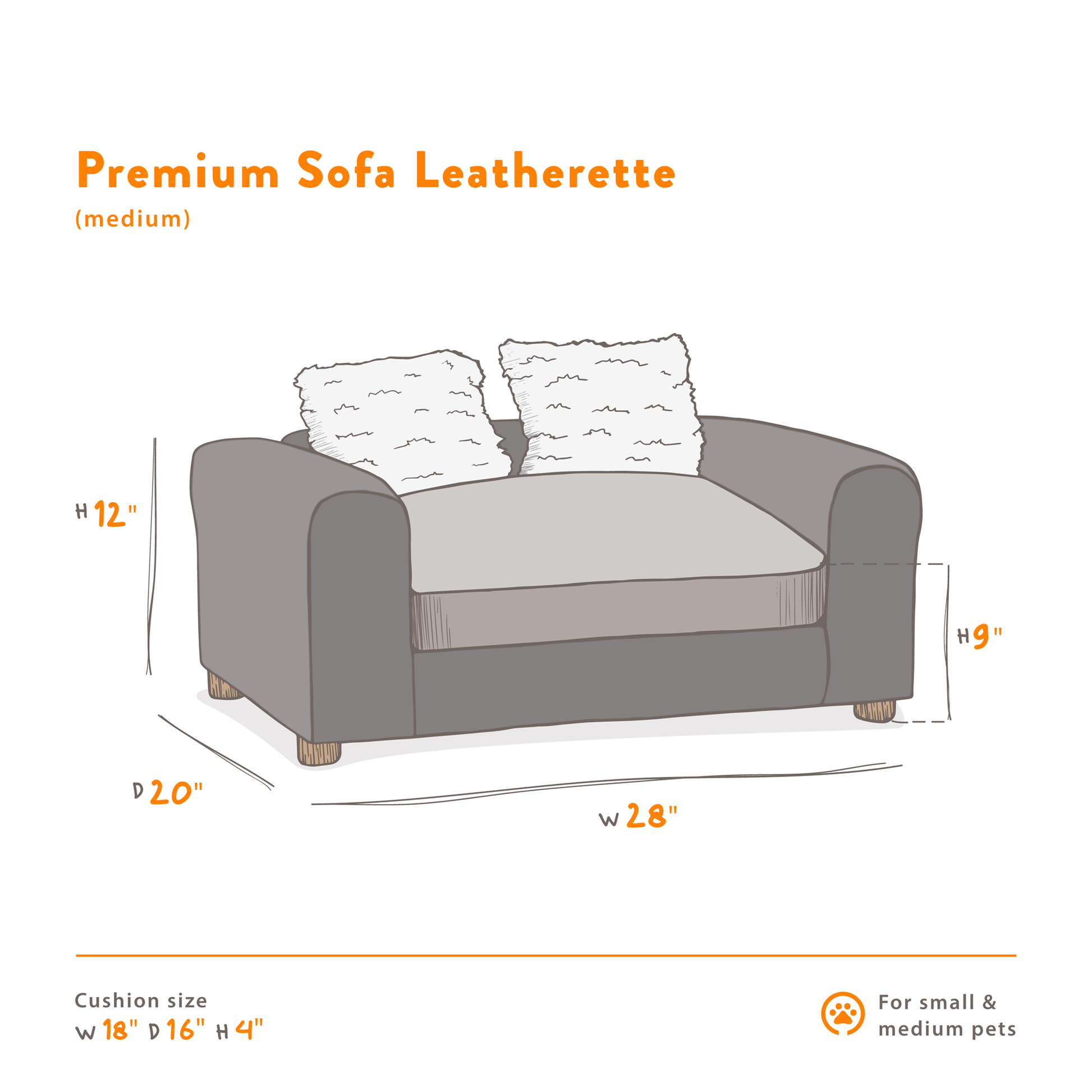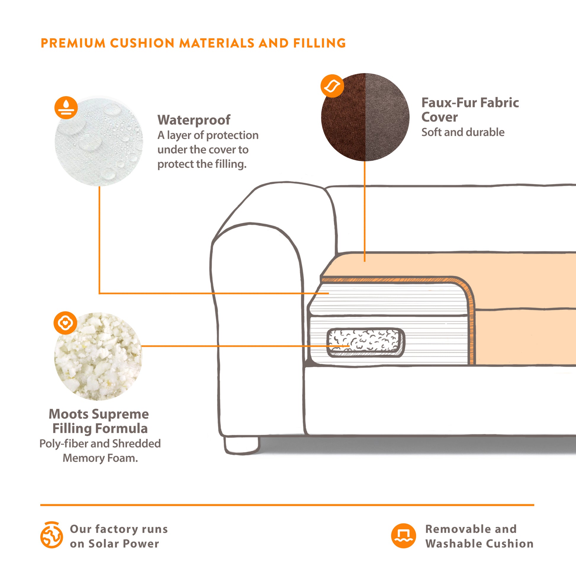 This stylish seating option features a strong wood frame and spot-clean-friendly leatherette fabric. It includes removable, washable cushions with waterproof liner covers, heavy-duty zippers, and Moots Supreme Filling Formula, plus two furry pillows.