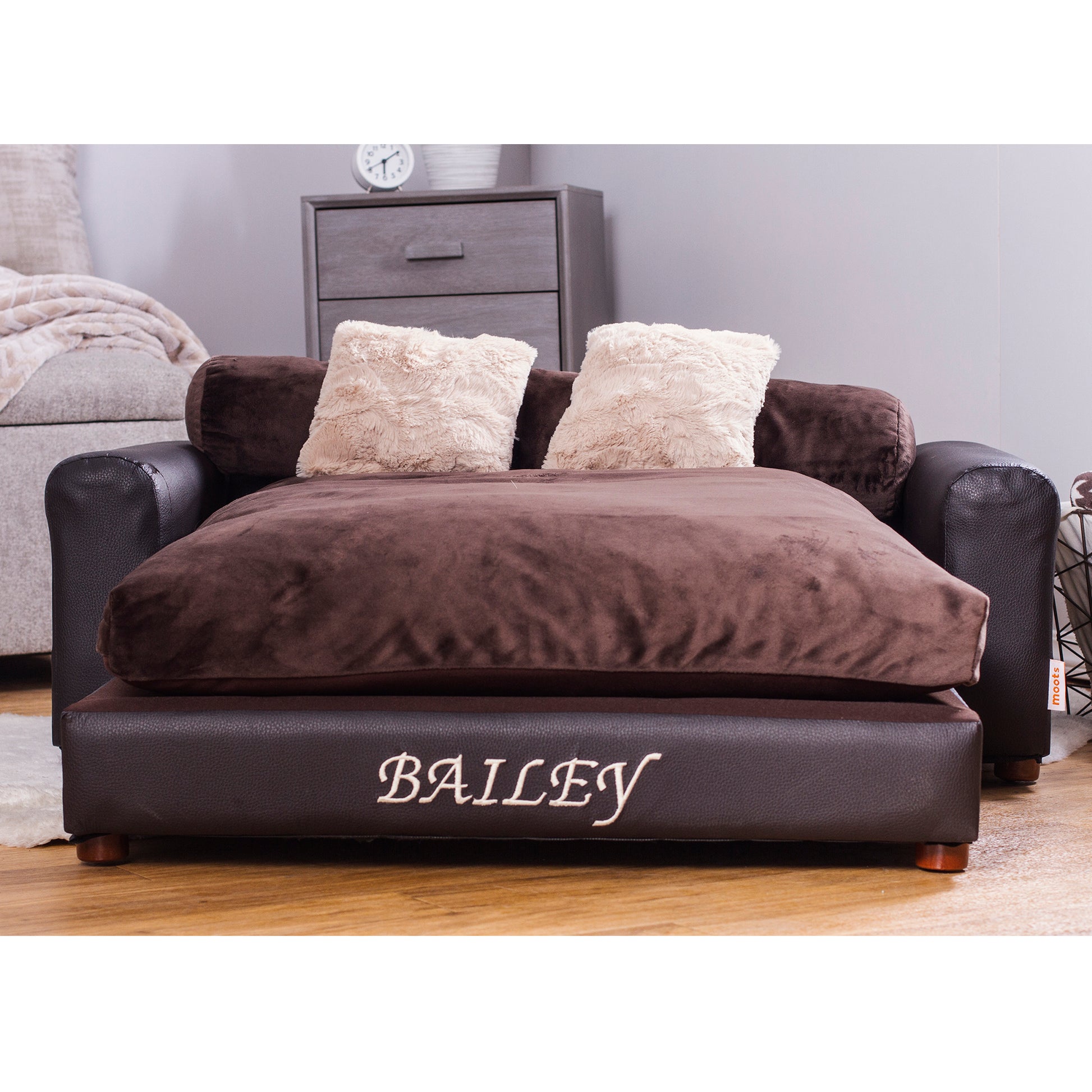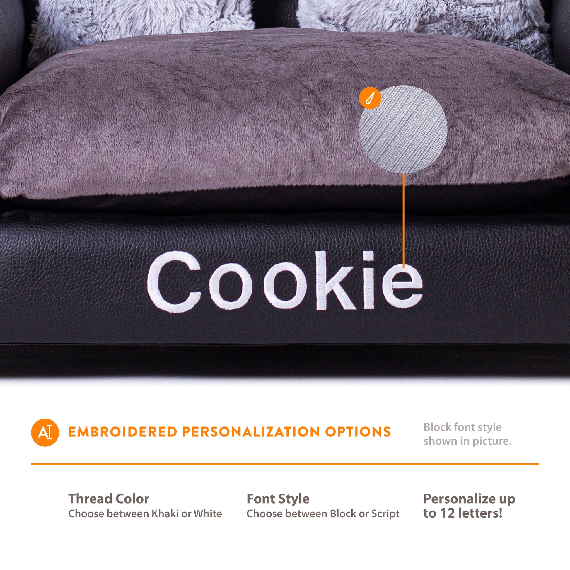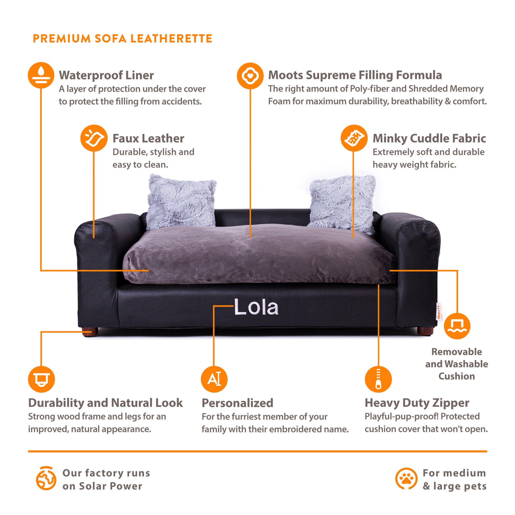This stylish seating option features a strong wood frame and spot-clean-friendly leatherette fabric. It includes removable, washable cushions with waterproof liner covers, heavy-duty zippers, and Moots Supreme Filling Formula, plus two furry pillows.